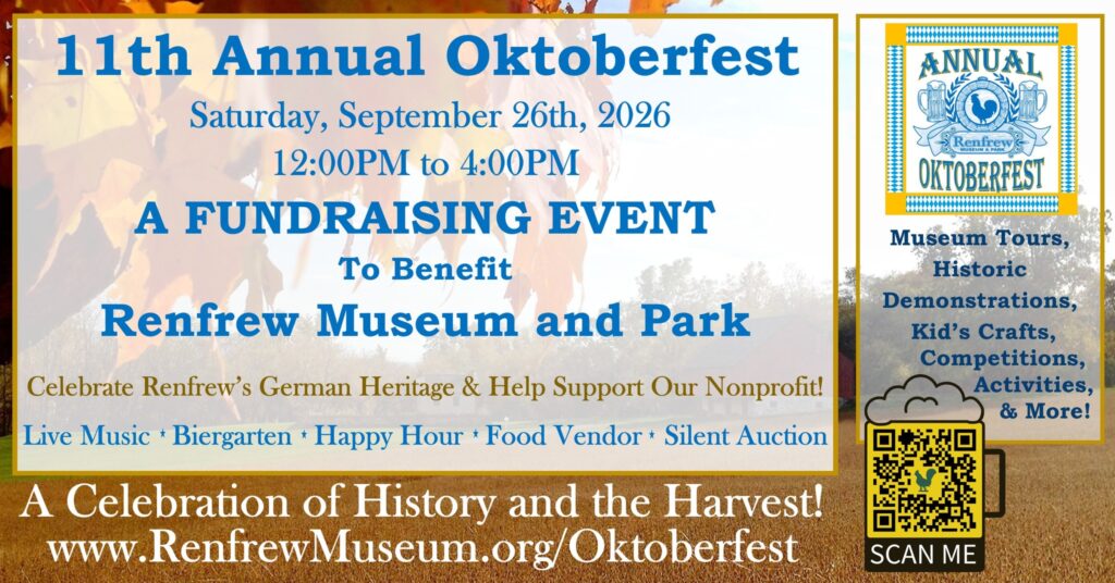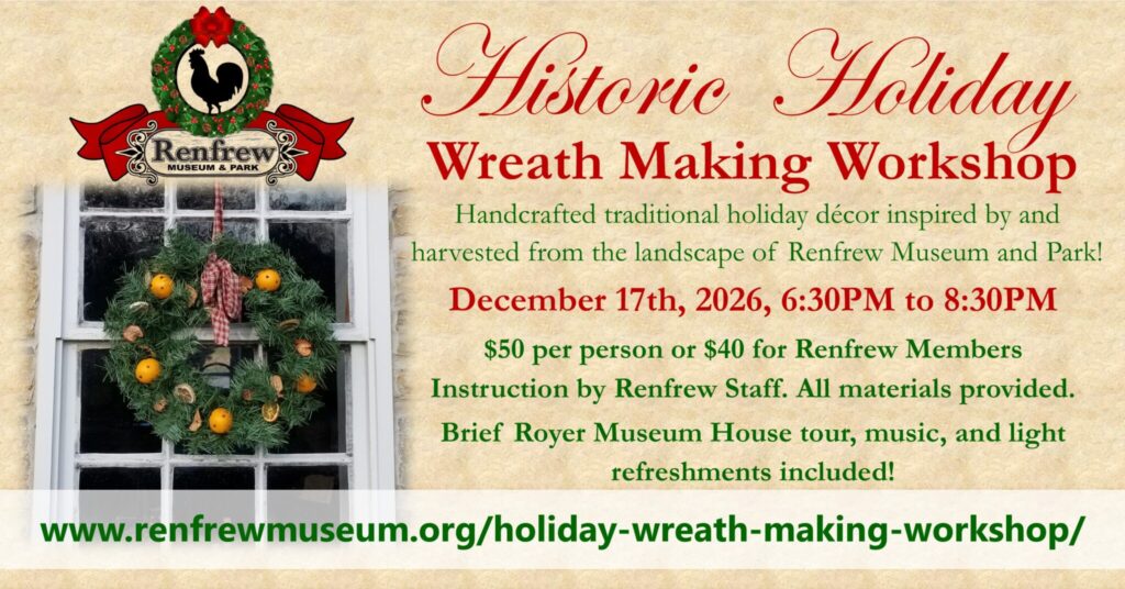 Events Upcoming Events at Renfrew! Make memories with friends, family, and neighbors at Renfrew Museum and Park with tours, programs, workshops, special events, and more! Click the digital banners below to learn more! 2026 Calendar January February Thursday, February 26th, 6:00PM – 8:00PM March Saturday, March 14th, 10:00AM – 1:00PM Thursday, March 19th, 6:00PM – 8:00PM April May Saturday, May 16th, 10:00AM – 1:00PM June Tuesday, June 9th, 6:00PM – 8:00PM July August Thursday, August 6th, 6:00PM – 8:00PM September Tuesday, September 15th, 6:00PM – 8:00PM October Saturday, October 10th, 10:00AM – 1:00PM November Saturday, November 7th, 10:00AM – 1:00PM December